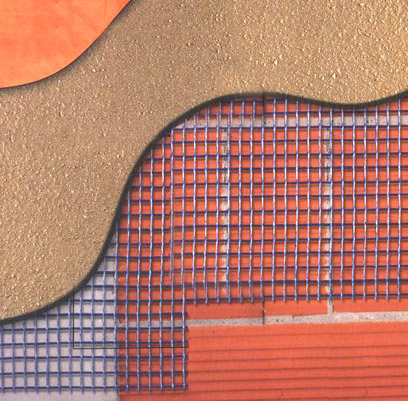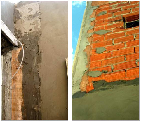 La aplicación de la malla se hace sobre una primera aplicación de mortero fresco, superponiendo las redes en unos 10 cm., luego se procede a una segunda aplicación de material teniendo cuidado de tapar la red completamente.